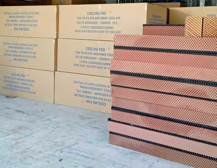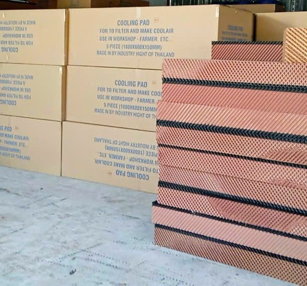 Các tấm làm mát cooling pad được máy bơm thường xuyên cung cấp nước bằng cách tưới đều trên đỉnh bề mặt của tấm phân phối. Sau đó nước được thẩm thấu, làm ướt toàn bộ bề mặt của các tấm làm mát. Không khí nóng và khô từ bên ngoài qua các tấm làm mát, trao đổi nhiệt trực tiếp với nước; Trở thành không khí sạch – mát hơn; Tạo độ ẩm thích hợp và giảm nhiệt độ không khí trong nhà xưởng.